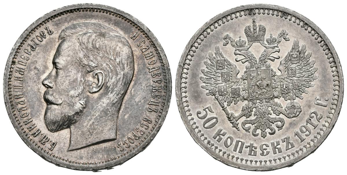 RUSIA. 50 Kopeks. 1912. Y#58.2. Ar. 10,83g. Bonita pátina. MBC.