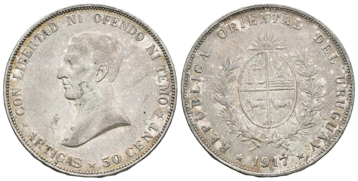 URUGUAY. 50 Centésimos. 1917. Km#22. Ar. 12,52g. Pátina. MBC+/MBC.