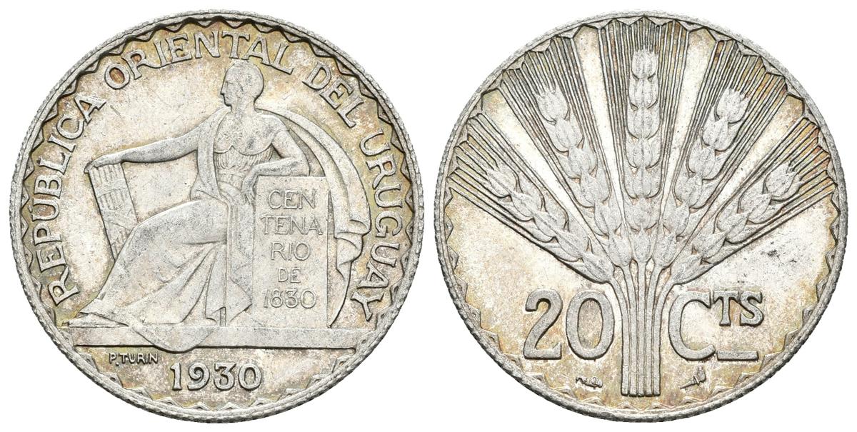 URUGUAY. 20 Centésimos. 1930. Km#26. Ar. 5,00g. Brillo original. Rayitas por limpieza. EBC.