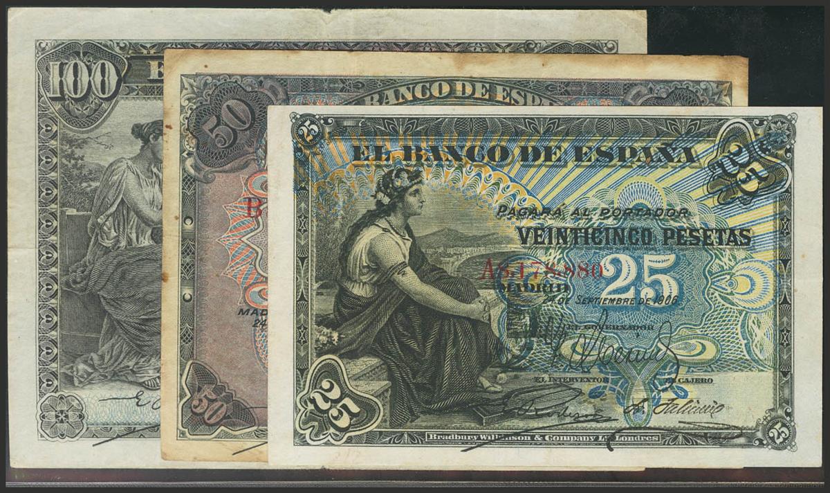 Conjunto de los billetes emitidos en el año 1906, correspondientes a los valores de 25, 50 y 100 Pesetas. A EXAMINAR. MBC/BC.