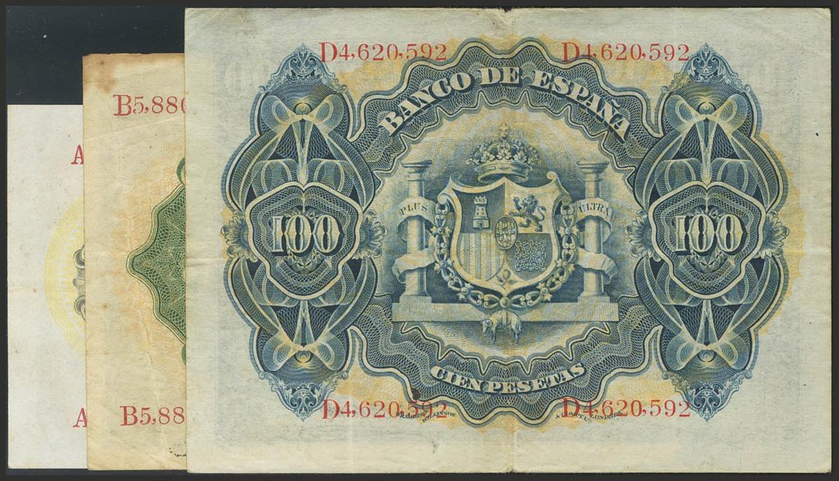Conjunto de los billetes emitidos en el año 1906, correspondientes a los valores de 25, 50 y 100 Pesetas. A EXAMINAR. MBC/BC.