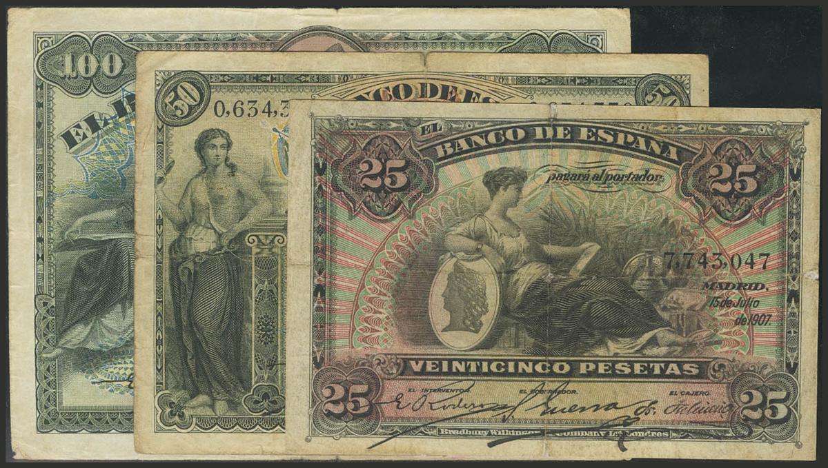 Conjunto de los billetes de 25, 50 y 100 Pesetas emitidos en el año 1907. A EXAMINAR. MBC/BC.