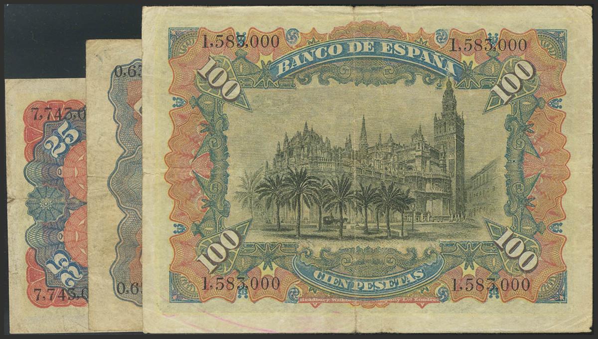 Conjunto de los billetes de 25, 50 y 100 Pesetas emitidos en el año 1907. A EXAMINAR. MBC/BC.
