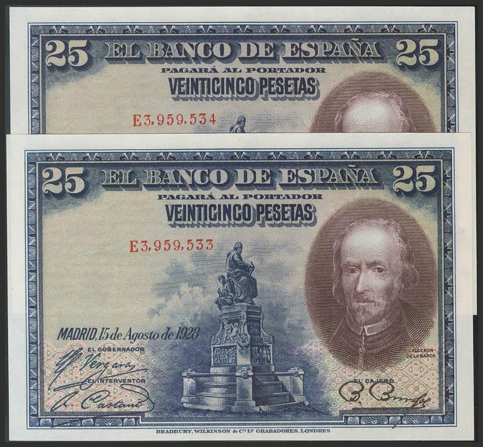 25 Pesetas. 15 de Agosto de 1928. Pareja correlativa. Serie E. (Edifil 2017: 353). Apresto original. SC.