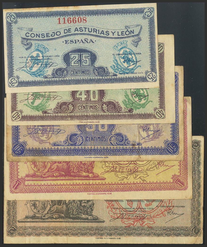 Conjunto de la serie completa de 5 billetes (25, 40 y 50 Céntimos y 1 y 2 Pesetas) de los billetes emitidos por el Consejo de Asturias y León en el año 1937. A EXAMINAR. MBC/BC.