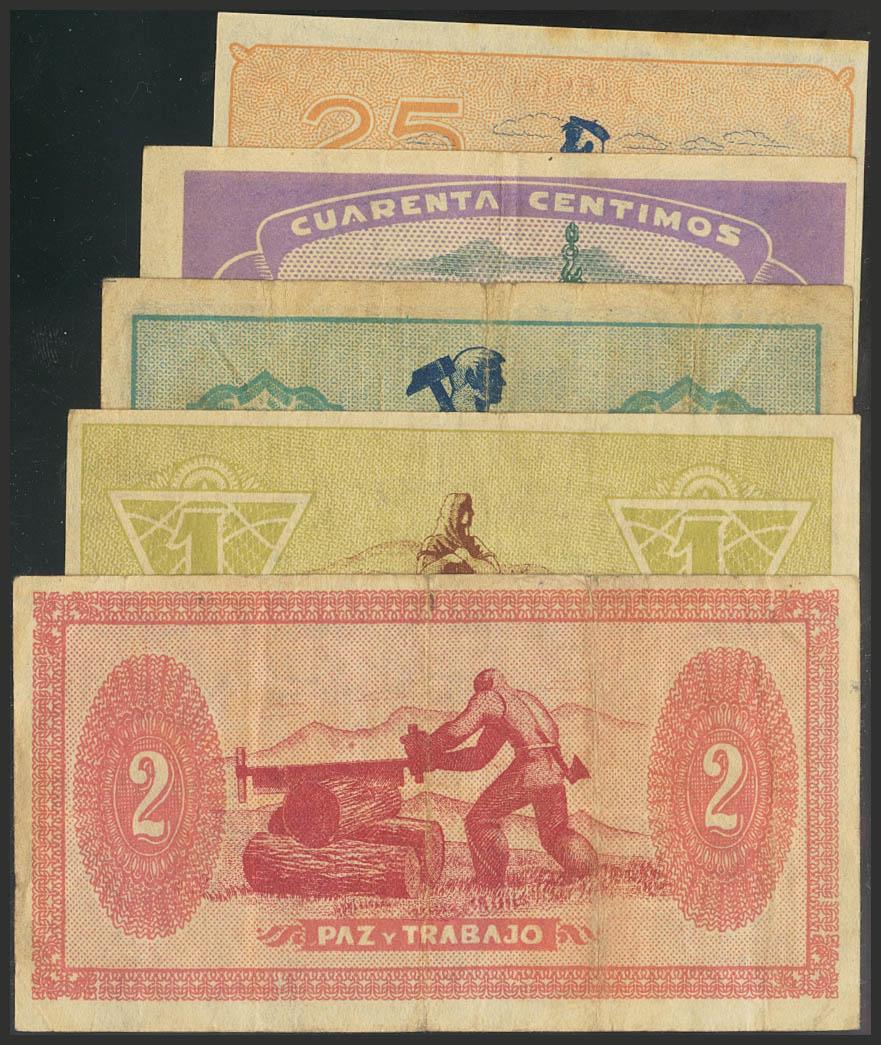 Conjunto de la serie completa de 5 billetes (25, 40 y 50 Céntimos y 1 y 2 Pesetas) de los billetes emitidos por el Consejo de Asturias y León en el año 1937. A EXAMINAR. MBC/BC.