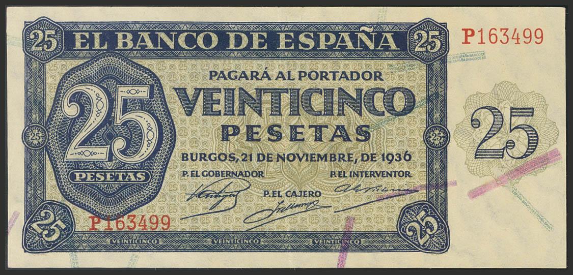 25 Pesetas. 21 de Noviembre de 1936. Banco de España, Burgos. Serie P. Invisible doblez horizontal. Apresto original. (Edifil 2017: 419). EBC.
