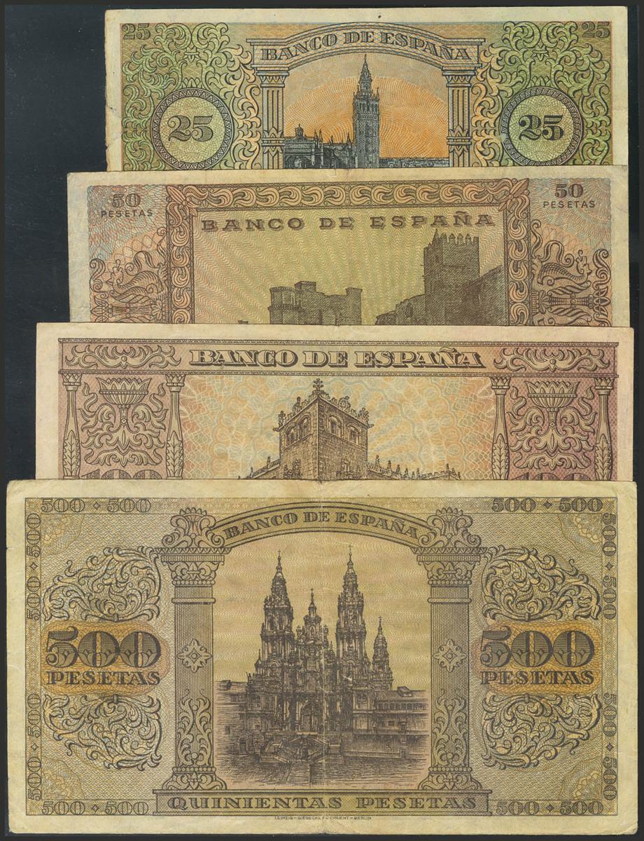 Conjunto de 4 billetes de 25 Pesetas (Serie A), 50 Pesetas (Serie A), 100 Pesetas (Serie B) y 500 Pesetas (Serie A), emitidos el 20 de Mayo de 1938, en Burgos. (Edifil 2017: 430, 431, 432a, 433). BC.