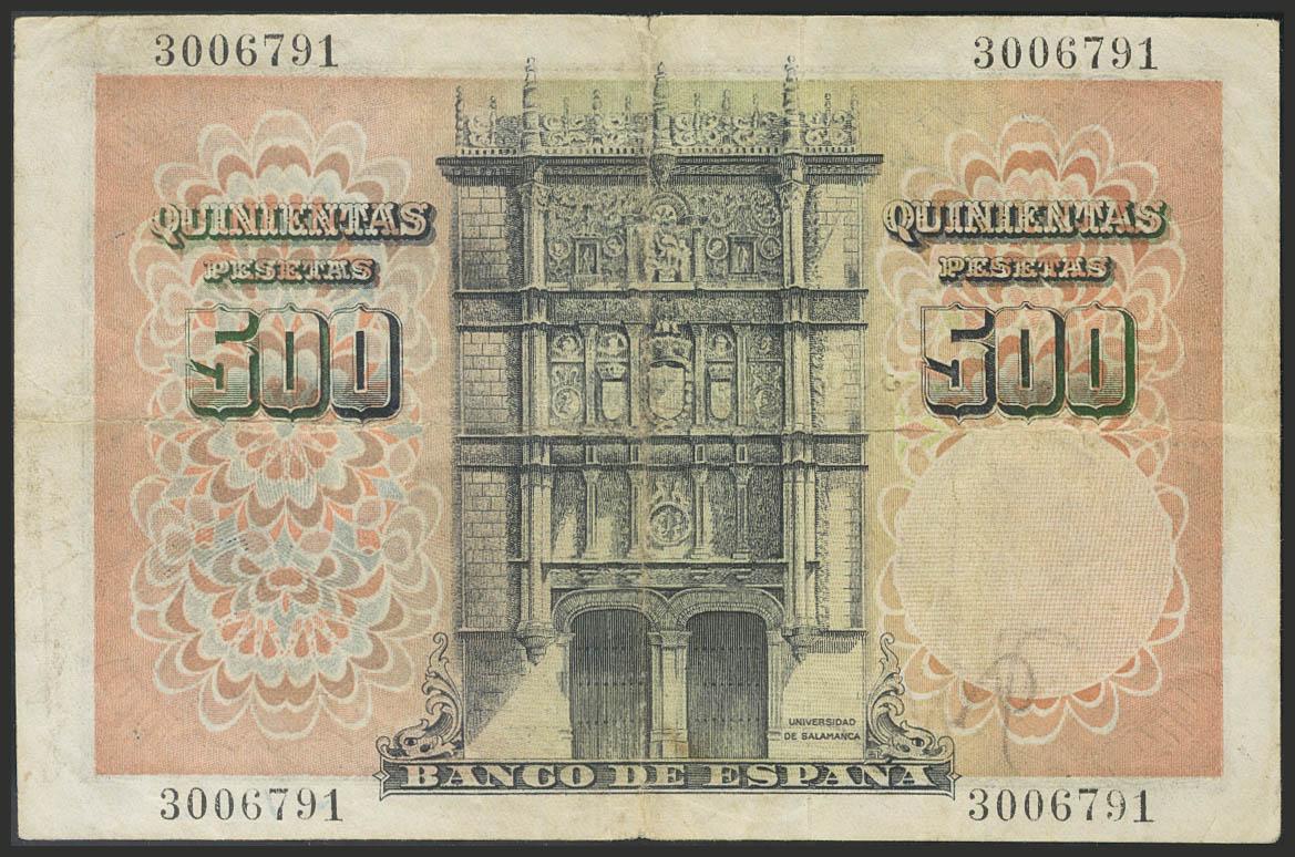 500 Pesetas. 19 de Febrero de 1946. Sin serie. Escritura en el frente a lápiz. (Edifil 2017: 452). MBC-.