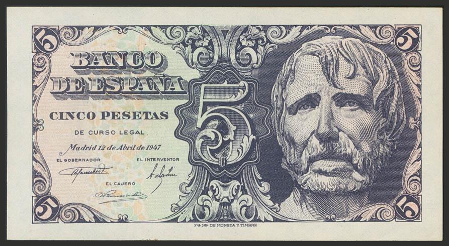 5 Pesetas. 12 de Abril de 1947. Serie D. (Edifil 2017: 454a). SC.