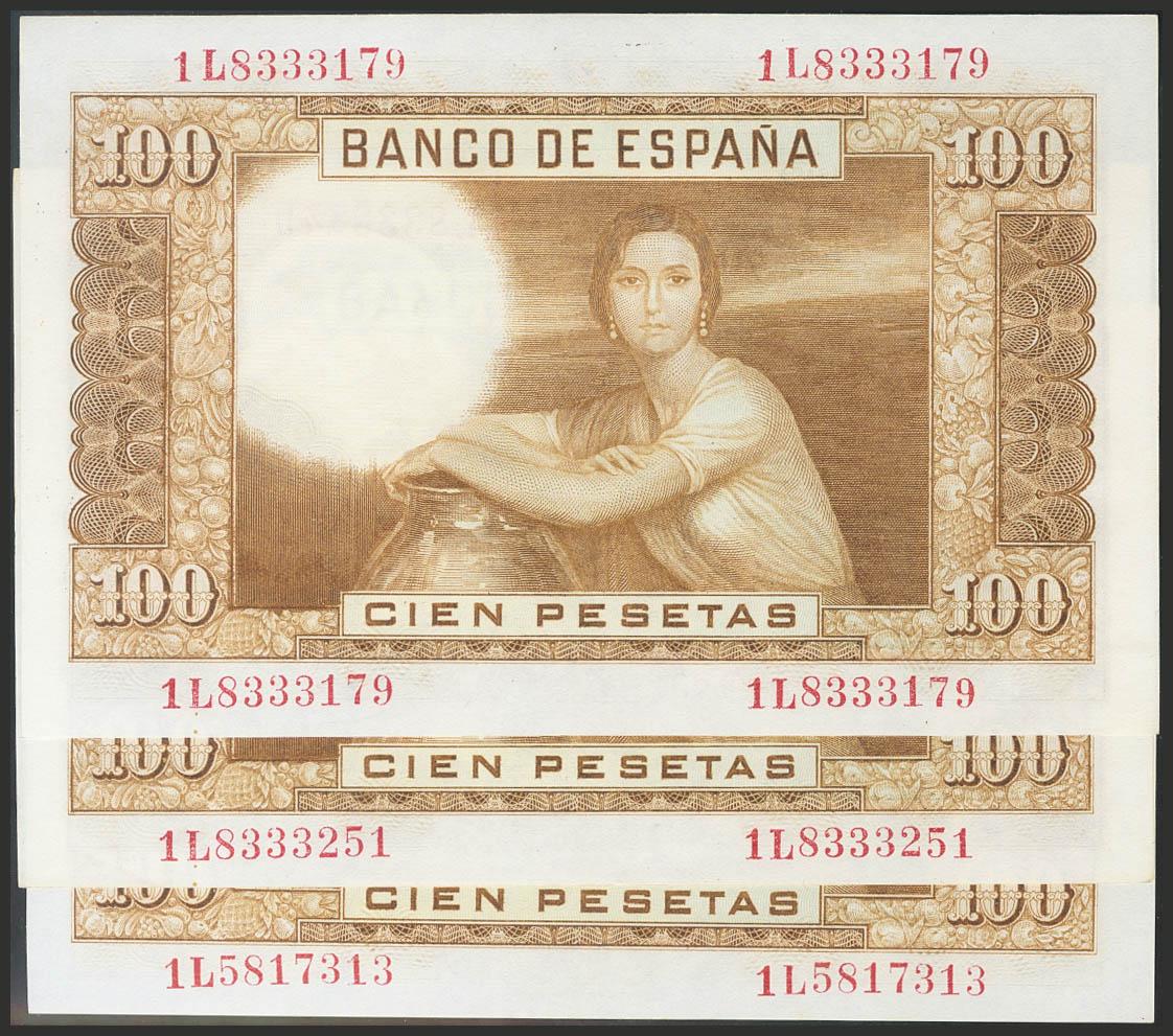 100 Pesetas. 7 de Abril de 1953. Serie 1L. Trío correlativo. (Edifil 2017: 464c). SC-.