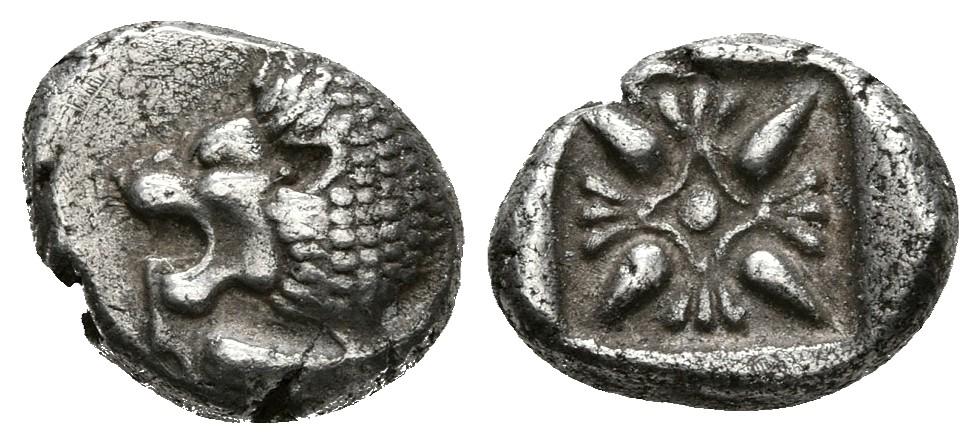 IONIA, Miletos. 1/12 Estátera. 550-525 a.C. A/ Parte delantera de león a izquierda. R/ Diseño floral dentro de cuadrado incuso. SNG Kayhan 476.481. Ar. 1,20g. MBC+.
