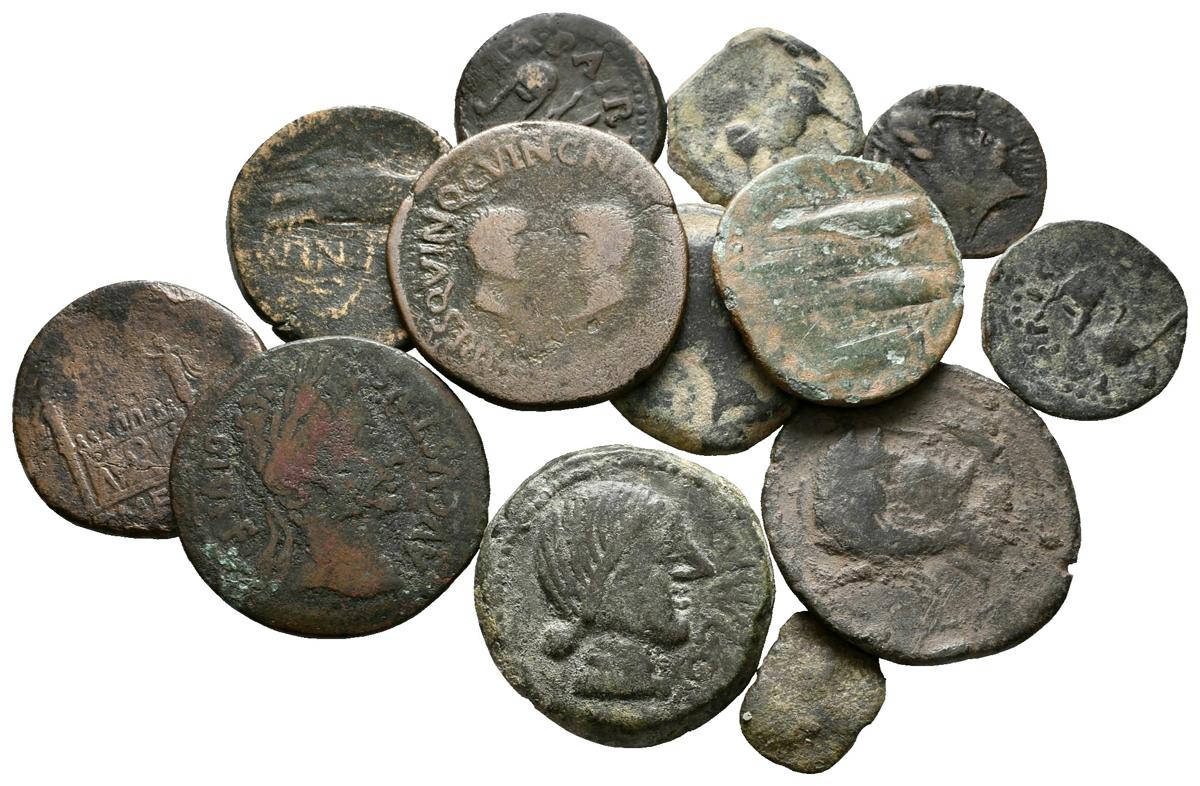 HISPANIA ANTIGUA. Lote compuesto por 13 bronces Ibéricos e Ibero-Romanos de las cecas de Cástulo, Colonia Patricia, Carteia, Obulco, Ivlia Traducta, Gades, Bilbilis, Cartagonova, Nimes y Lugdunum. BC-/MBC-. A EXAMINAR.