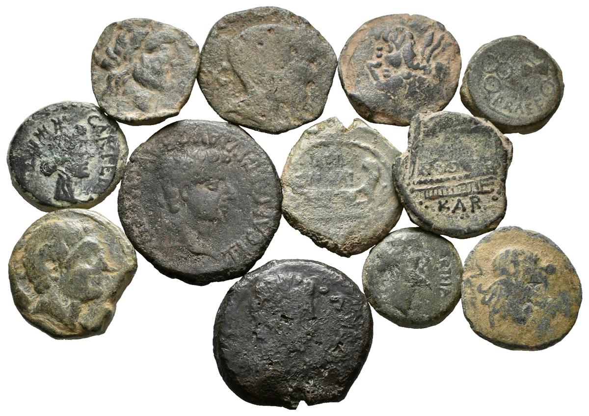 HISPANIA ANTIGUA. Lote compuesto por 12 monedas ibéricas de diferentes módulos y cecas: Carteia, Carmo, Acci, Iliberri, Cascantum y Cartagonova, incluyendo también un semis Republicano. Ae. BC+/MBC-. A EXAMINAR.
