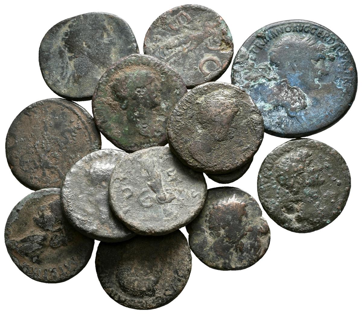 IMPERIO ROMANO. Lote compuesto por 14 bronces del Alto Imperio pertenecientes a Claudio (4 Ases y 2 Cuadrantes), Nerva (As), Trajano (Sestercio y As), Adriano (2 Ases), Marco Aurelio (Sestercio y As) y Faustina (As). BC-/MBC-. A EXAMINAR.