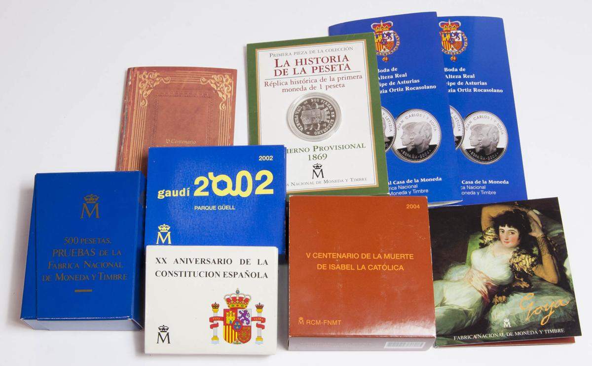 CONTEMPORANEO. Lote compuesto por Cartera oficial "La primera moneda de 1 Peseta" 1869, Cartera oficial de 2000 Pesetas 1996 (Goya), Cartera oficial de 12 Euros (Isabel la Católica), 2 Carteras oficiales de 12 Euros (Boda Real del Príncipe de Asturias y Letizia), Estuche oficial de 1000 Pesetas 1998 (XX Aniversario de la Constitución Española), Estuche oficial de 10 Euros 2002 (Gaudí, Parque Guell), Estuche oficial de 10 Euros 2004 (V Centenarío de la muerte de Isabel la Católica) y Estuche oficial de las 500 Pesetas 1987 "Así nace una moneda". SC.