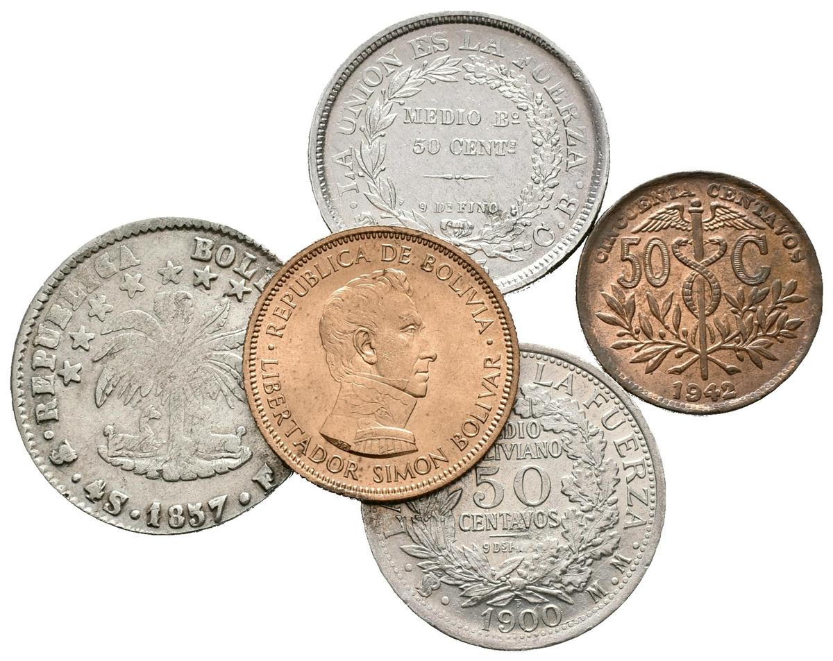 BOLIVIA. Lote compuesto por 5 monedas: 4 Soles. 1857. Potosí FJ; 1/2 Boliviano. 1893. Potosí CB; 1/2 Boliviano. 1900. Potosí MM; 50 Céntimos. 1942 y 1 Bolívar. 1951. Ar-Ae. MBC-/SC.