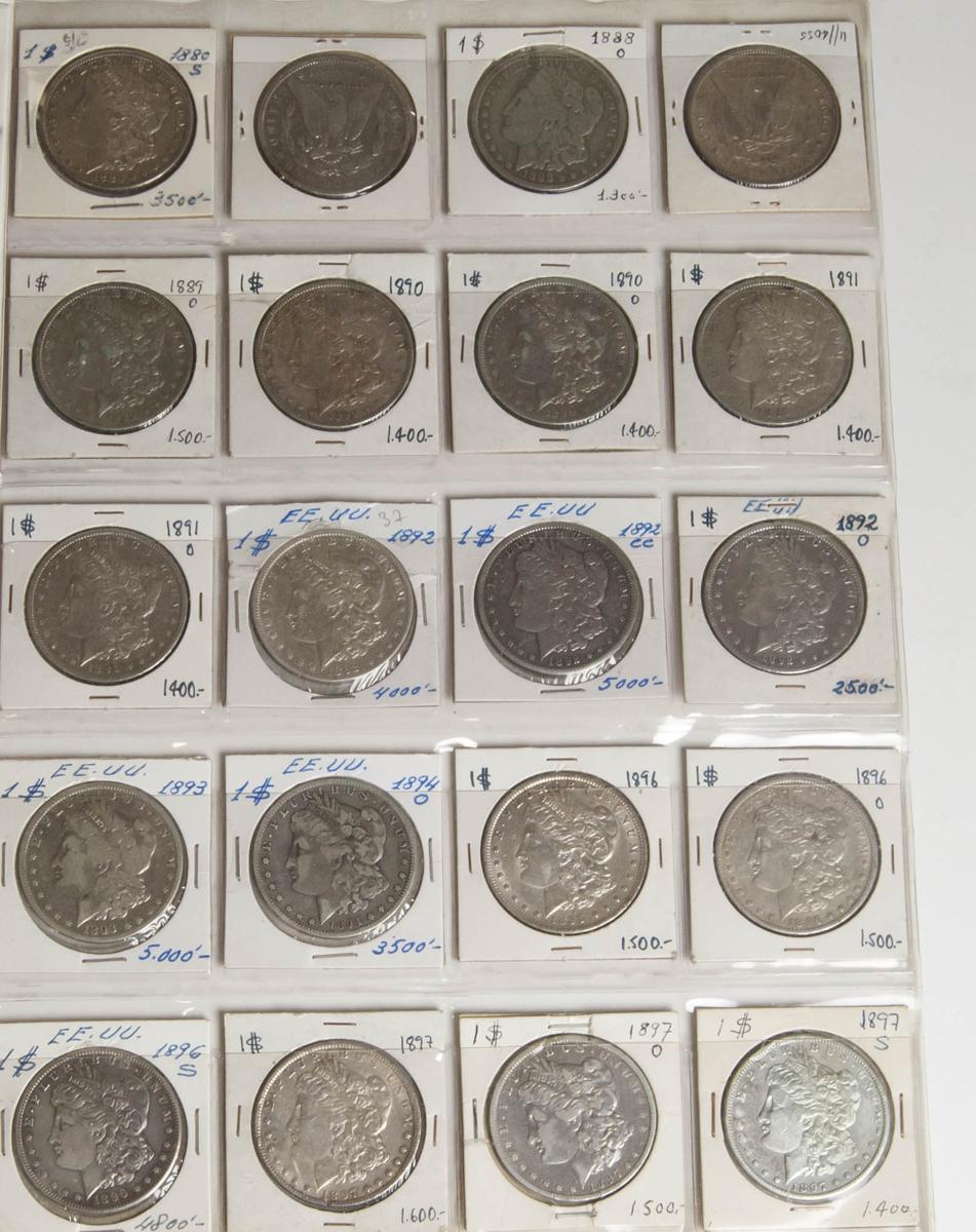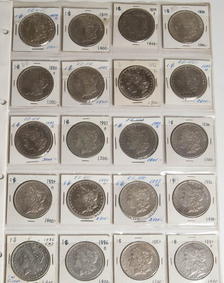 ESTADOS UNIDOS. Colección avanzada compuesta por 56 monedas de 1 Dollar tipo Morgan. Conteniendo 1878, 1878 S, 1879, 1879 O, 1879 S, 1880, 1880 O, 1880 S, 1881, 1881 S, 1882 O, 1882 S, 1883 O, 1883 S, 1884, 1884 O, 1884 S, 1885 S, 1886, 1886 (Falsa), 1886 O, 1887, 1887 O, 1888, 1888 O, 1889, 1889 O, 1890, 1890 O, 1891, 1891 O, 1892, 1892 CC, 1892 O, 1893, 1894 O, 1896, 1896 O, 1896 S, 1897, 1897 O, 1897 S, 1898, 1898 S, 1899 O, 1900, 1900 O, 1901 O, 1901 S, 1902, 1903, 1904, 1904 S, 1921, 1921 D y 1921 S. Incluye alguna fecha escasa. Ar. MBC/EBC-. A EXAMINAR.