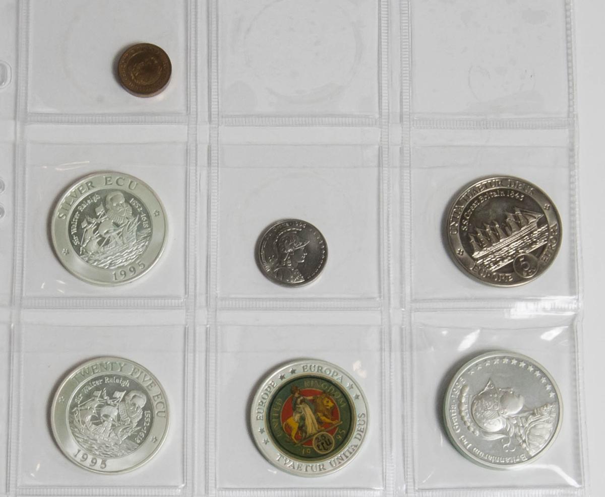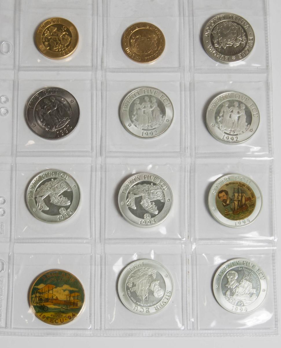 REINO UNIDO. Conjunto de 30 monedas Ecu incluyendo desde el año 1992 a 1996, incluyendo del año 1992: 1/10 Ecu (Ae 3,07g), 1/10 Ecu "Piedfort" (Ae 6,12g), 1/4 Ecu (Ae 6,39g) (tonalizada), 1/4 Ecu "Piedfort" (Ae 12,91g) (tonalizada), 1/2 Ecu (Ar 3,72g), 1/2 Ecu "Piedfort" (Ar 7,00g), 1 Ecu (Ar 5,26g), 1 Ecu "Piedfort" (Ar 9,86g), Silver Ecu (Ar 23,13), Silver Ecu "Piedfort" (Ar 45,75g), 2 Ecus (Ar 8,76g), 2 Ecus "Piedfort" (Ar 16,79g), 5 Ecus "Piedfort" (Ar 28,42g), 5 Ecus (Ar 20,60g), 10 Ecus (Bronce bañado en oro 9,79g), 10 Ecus "Piedfort" (Bronce bañado en oro 18,48), 25 Ecus (Ar 22,84g) y 25 Ecus "Piedfort" (Ar 45,62g). Del año 1993: 25 Ecus (Ar 24,92g) y 25 Ecus "Piedfort" (Ar 50,22). Del año 1994: 1 Ecu (Plata esmaltada 24,19g), 1 Ecu (Bronce bañado en bronce y con dibujo en anverso 20,05), Silver Ecu (Ar 23,51) y 25 Ecus (Ar 23,99) y del año 1995: 1 Ecu (Ar 5,18g), Silver Ecu (Ar 23,81g), 5 Ecus (Ar 18,82g), 25 Ecus (Ar 23,83g), 25 Ecus (Plata esmaltada 24,29g) y 25 Ecus "Piedfort" (Ar. 49,08g). Peso de plata total: 529,29g. A EXAMINAR. PROOF. Todas las monedas presentadas sin estuche oficial.