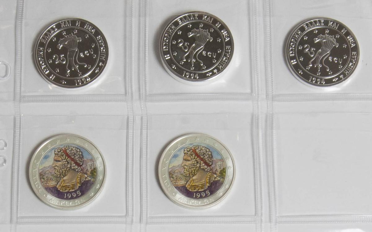 GRECIA. Conjunto de 17 monedas de Ecu desde 1992 hasta 1995, incluyendo del año 1992: 10 Ecus (Ar 10,01g) y 25 Ecus (Ar 28,06g). Del año 1993: 10 Ecus (Ar 9,98g), 20 Ecus (Ar 20,41g), 20 Ecus "Piedfort" (Ar 50,08g), 20 Ecus (Ar 25,00g), 25 Ecus "Piedfort" (Ar 56,02g) y 25 Ecus (Ar 28,09g). Del año 1994: 10 Ecus "Piedfort" (Ar 19,99g), 10 Ecus (Ar 10,00g), 10 Ecus (Ar 10,00g), 20 Ecus (Ar 23,58g), 20 Ecus (Ar 23,50g), 25 Ecus (Ar 28,20g), 25 Ecus "Piedfort" (Ar 55,88g) y 25 Ecus (Ar 28,00g). Del año 1995: 1 Ecu (Plata esmaltada 24,74g) y 1 Ecu (Plata esmaltada 25,12g). Peso total de la plata: 426,42g. A EXAMINAR. PROOF. Todas las monedas sin estuche oficial.
