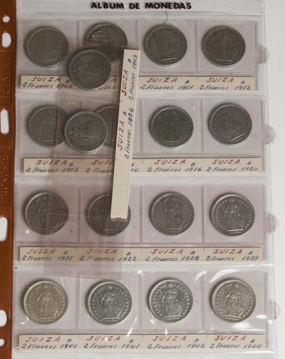 SUIZA. Lote compuesto por 34 monedas de plata. Conteniendo 2 Francs. 1886, 1903, 1905, 1910, 1911, 1912, 1913, 1914, 1916, 1920, 1921, 1922, 1928, 1939, 1940, 1941, 1943, 1944, 1945, 1946, 1948, 1955, 1958, 1960, 1961, 1963, 1964, 1965 y 1967, 5 Francs 1967, 1931, 1932, 1933, 1935 y 1939. Ar. BC+/EBC. A EXAMINAR.