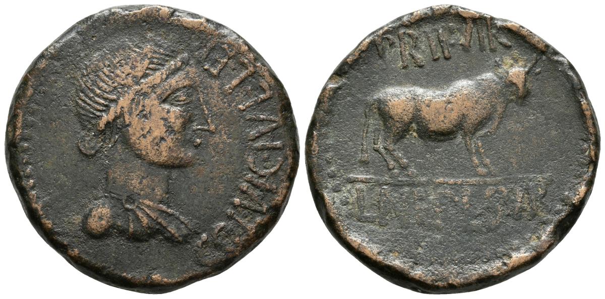 CELSA-KELSE. As. Acuñación de transición. 50-30 a.C. Velilla de Ebro (Zaragoza) A/ Busto femenino a derecha. COl.VIC.IVL.LEP. R/ Toro a derecha, encima P.R.IIVIR, debajo L.NEP.L.SVRA. FAB-794. Ae. 18,68g. MBC.