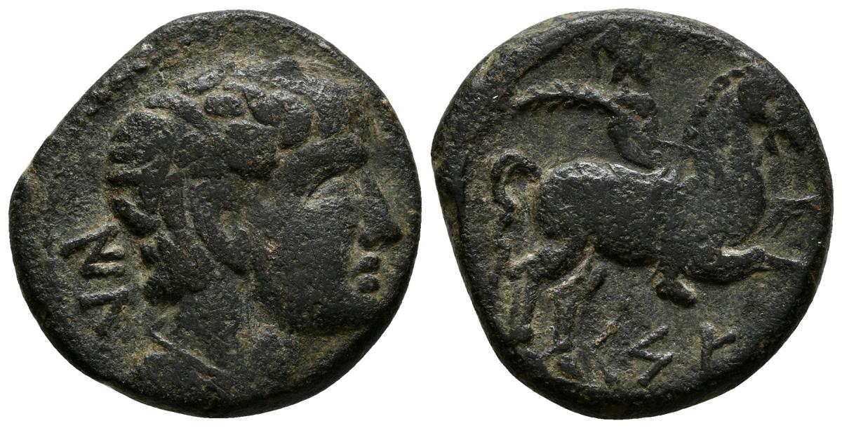 CESE. As. 120-20 a.C. Tarragona. A/ Cabeza masculina a derecha, detrás letras ibéricas IL, delante S. R/ Jinete con palma a derecha y debajo CeSE. FAB-2295. Ae. 8,87g. MBC-.