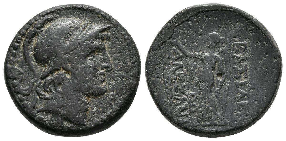 ALEJANDRO I BALAS. Ae. 152-145 a.C. Antioquía (Reino Seleucida). A/ Cabeza de Alejandro I con casco a derecha. R/ Nike estante a izquierda sosteniendo corona y palma, bajo esta monograna y a la izquierda espiga. SC 1790.4; HGC 9, 899. Ae. 5,94g. MBC-.