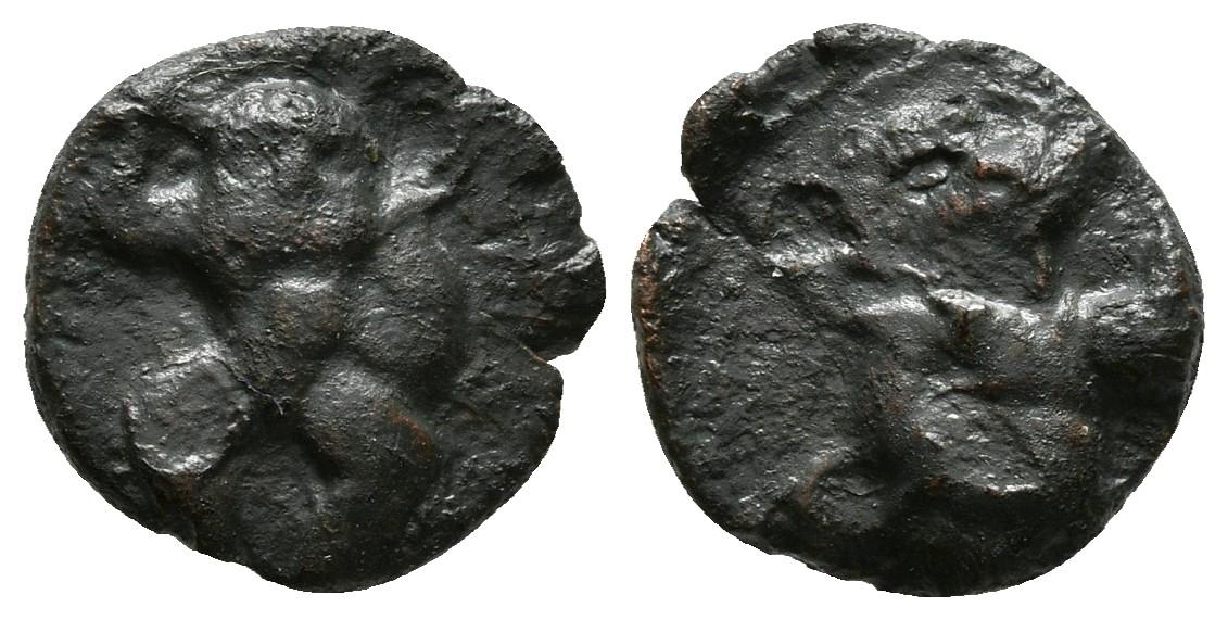 EBUSUS. 1/8 Calco. 200-100 a.C. Ibiza (Islas Baleares). A/ Bes de frente sosteniendo un martillo y una serpiente. R/ Bes de frente sosteniendo un martillo y una serpiente. FAB-913. AE. 1,22g. MBC-.