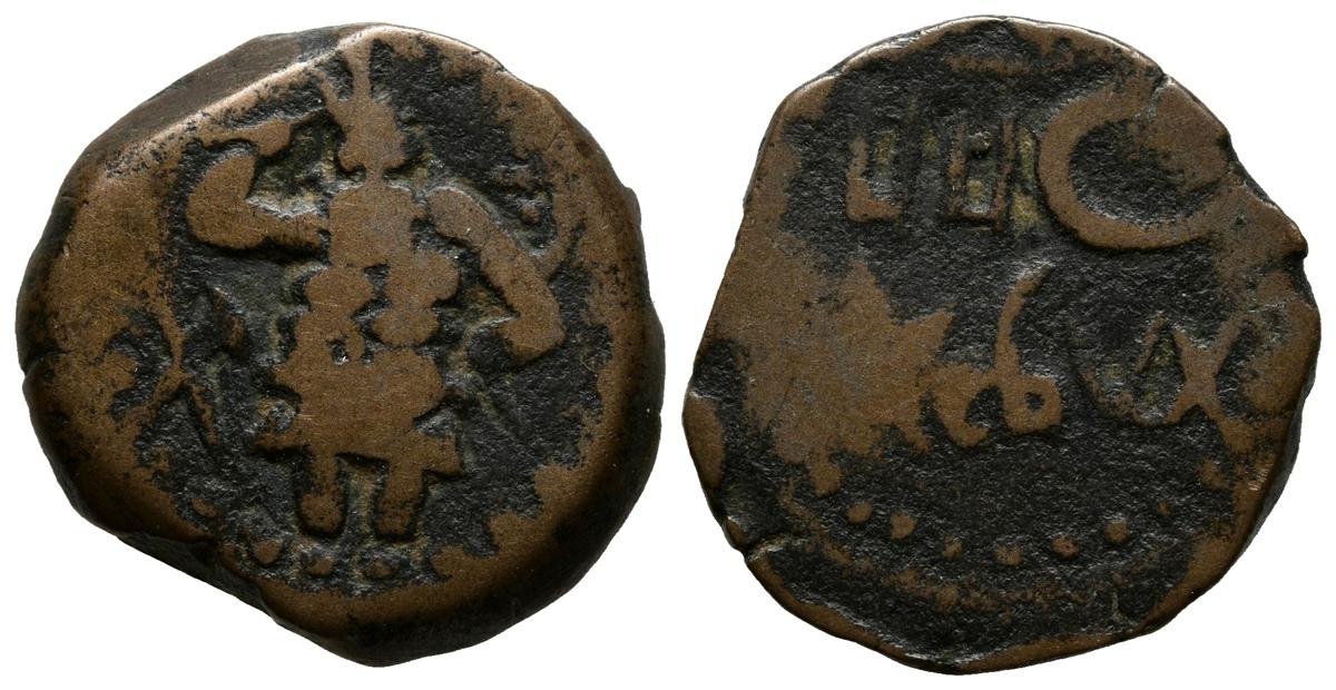 EBUSUS. Semis. 200-100 a.C. Ibiza (Islas Baleares). A/ Bes con maza y serpiente, a la izquierda, letra fenicia Aleph. R/ Leyenda fenicia en dos líneas Ybsm y marca de valor L. FAB-946. Ae. 5,77g. BC+/MBC-.