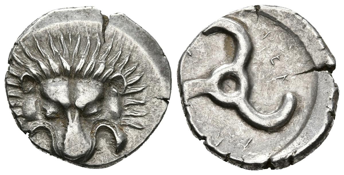 LYCIA, Perikles. 1/3 Estátera. 380-370 a.C. A/ Piel de león de frente. R/ Triskeles incuso. Falghera 217; SNG von Aulock 4254-6. Ar. 2,59g. MBC+.