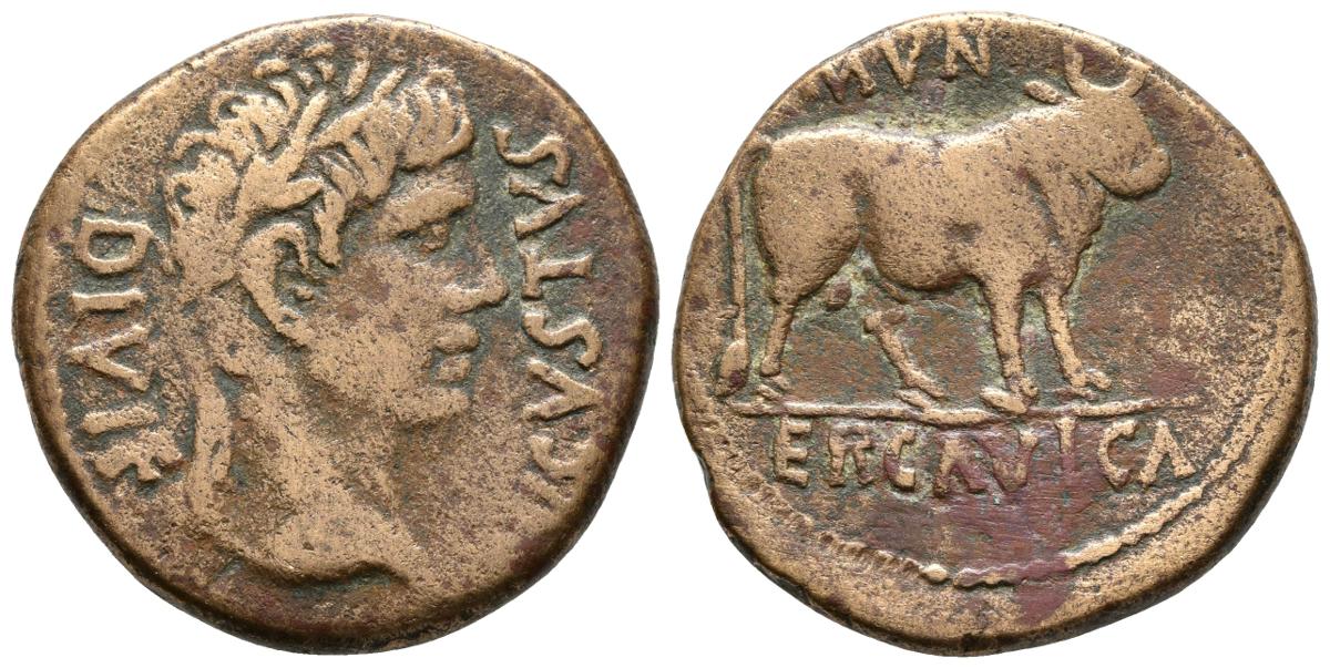 ERCAVICA. As. Epoca de Augusto. 27 a.C.-14 d.C. Cañaveruelas (Cuenca). A/ Cabeza (Grande) laureada de Augusto a derecha, alrededor AVGVSTVS DIVI·F. R/ Toro a derecha con rabo recto, encima MVN, debajo ERCAVICA. FAB-1278. Ae. 12,25g. MBC-. Escasa.