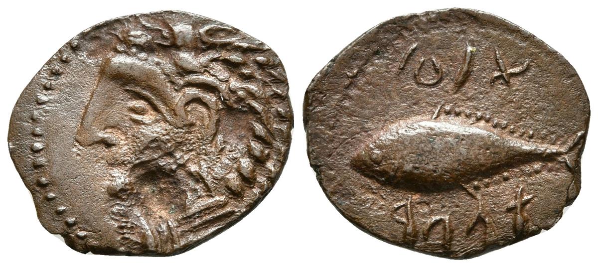 GADES. Semis. 100-20 a.C. Cádiz. A/ Cabeza de Hércules con piel de león a izquierda, detrás clava. R/ Atún a izquierda, encima y debajo leyenda púnica. FAB-1346. Ae. 2,00g. Fallo del metal en anverso. MBC+.