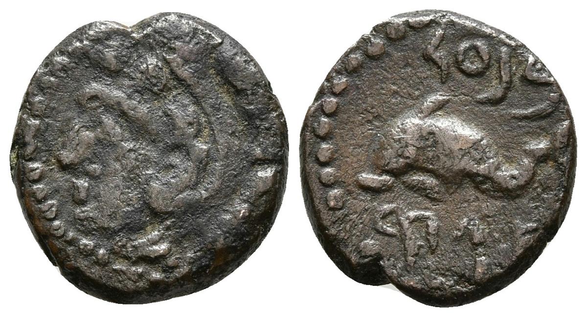 GADES. Sextante. 100-20 a.C. Cádiz. A/ Cabeza de Hércules con piel de león a izquierda, detrás clava. R/ Delfín a izquierda, encima y debajo leyenda púnica. FAB-1357. Ae. 2,01g. MBC-.