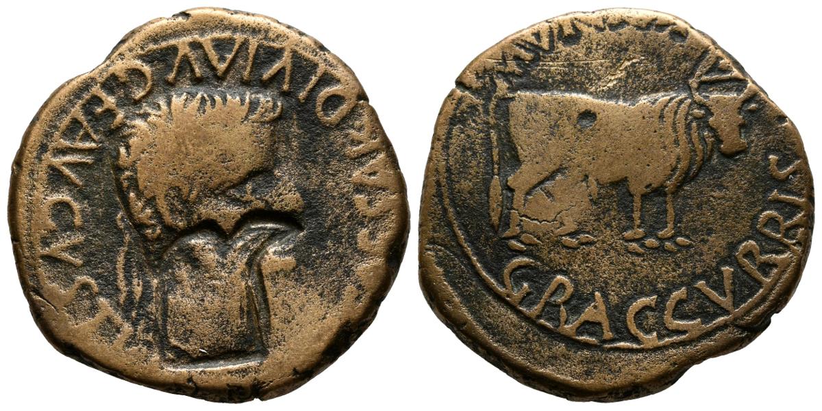 GRACCURRIS. As. Epoca de Tiberio. 14-36 d.C. Alfaro (La Rioja). A/ Cabeza laureada a derecha, alrededor leyenda externa TI CAESAR DIVI AVG F AVGVSTVS. R/ Toro mitrado a derecha, encima leyenda interna MVNICIP, debajo leyenda externa GRACCVRRIS. FAB-1391. Ae. 9,84g. Contramarca de cabeza de águila a derecha en anverso. BC+.