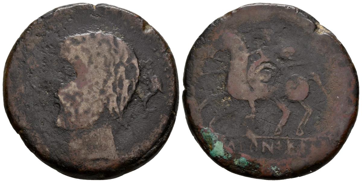 ICALCUNSCEN. As. 120-20 a.C. Iniesta (Cuenca). A/ Cabeza masculina a izquierda, delante caduceo, detrás delfín. R/ Jinete con lanza y rodela a izquierda, debajo ICaLCuNSCeN. FAB-1416. Ae. 17,81g. BC-. Escasa.