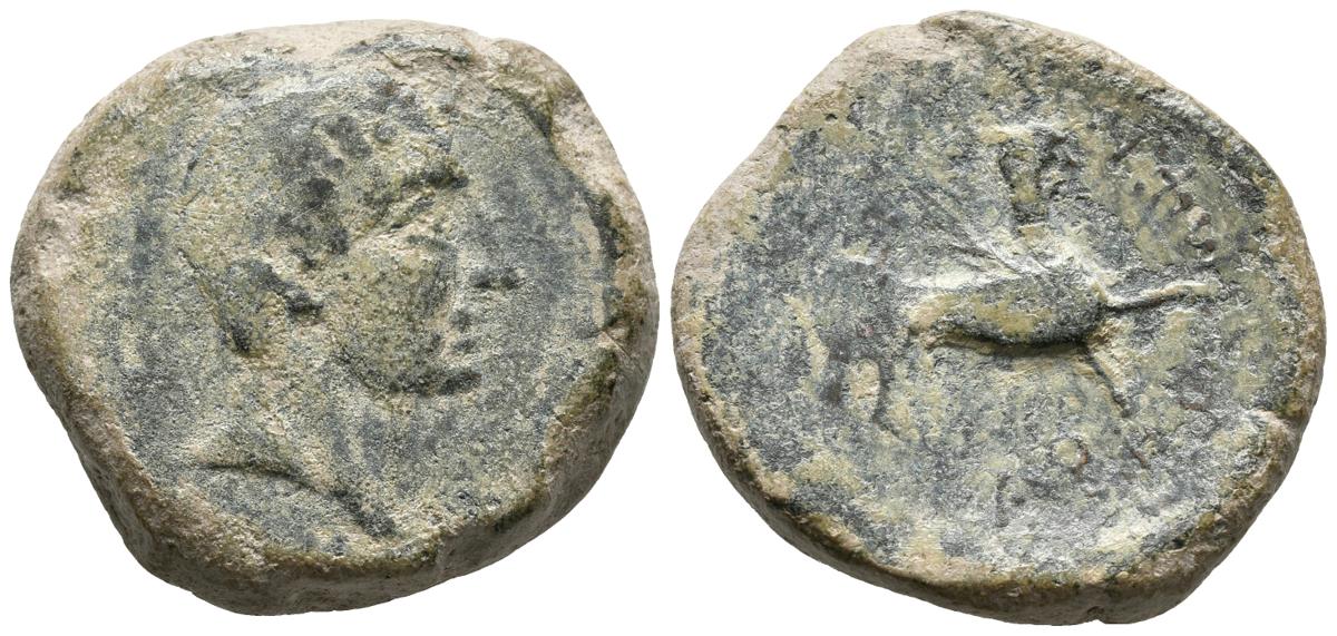 ILIBERRI. As. 150-20 a.C. Granada. A/ Cabeza masculina a derecha. R/ Esfinge a derecha, debajo en leyenda curva ILDuRIRCeSTIN. FAB-1496. Ae. 25,84g. MBC-. Escasa.