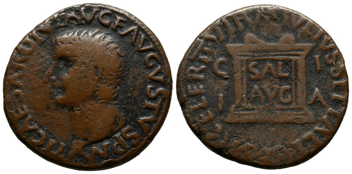 ILICI. As. Epoca de Tiberio. 14-36 d.C. Elche (Alicante). A/ Cabeza laureada de Tiberio a izquierda, leyenda TI CAESAR DIVI AVG F·AVGVSTVS·P·M. R/ Ara con cartela dentro en dos líneas SAL-AVG, a los lados C·I·I·A y alrededor M·IVLIVS·SETAL·L·SEST CELER II VIR. FAB-1522. Ae. 11,63g. MBC.