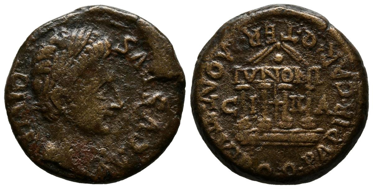 ILICI. Semis. Epoca de Augusto. 50-30 a.C. Elche (Alicante). A/ Cabeza laureada de Augusto a derecha, leyenda AVGVSTVS DIVI. F. R/ Templo tetrástilo, en el arquitrave I V NONI, entre las columnas C I I A, alrededor Q TER MONT II VIR Q. FAB-1519. Ae. 6,05g. MBC/MBC+.