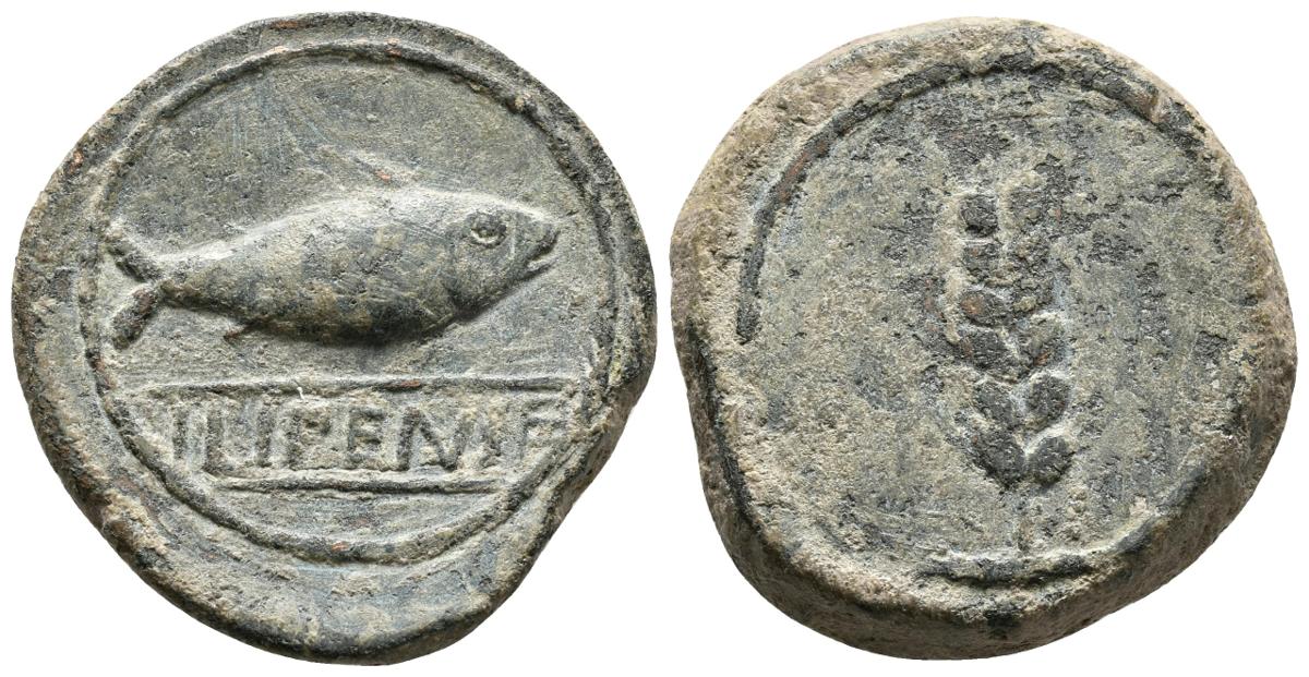 ILIPENSE. Semis. 120-20 a.C. Alcalá del Río (Sevilla). A/ Sábalo a derecha, debajo ILIPENSE en cartela. R/ Espiga. FAB-1534. Ae. 16,22g. MBC+/MBC-.