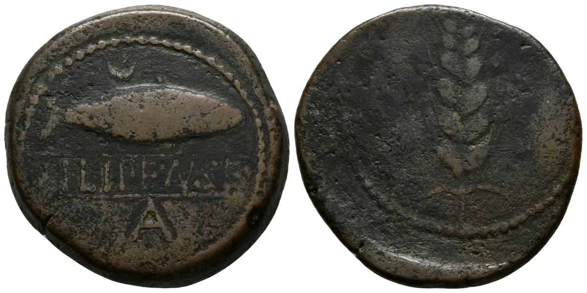 ILIPENSE. As. 120-20 a.C. Alcalá del Río (Sevilla). A/ Sábalo a derecha, encima creciente, leyenda entre líneas ILIPENSE, debajo A. R/ Espiga. FAB-1532. Ae. 18,55g. MBC-/BC+.