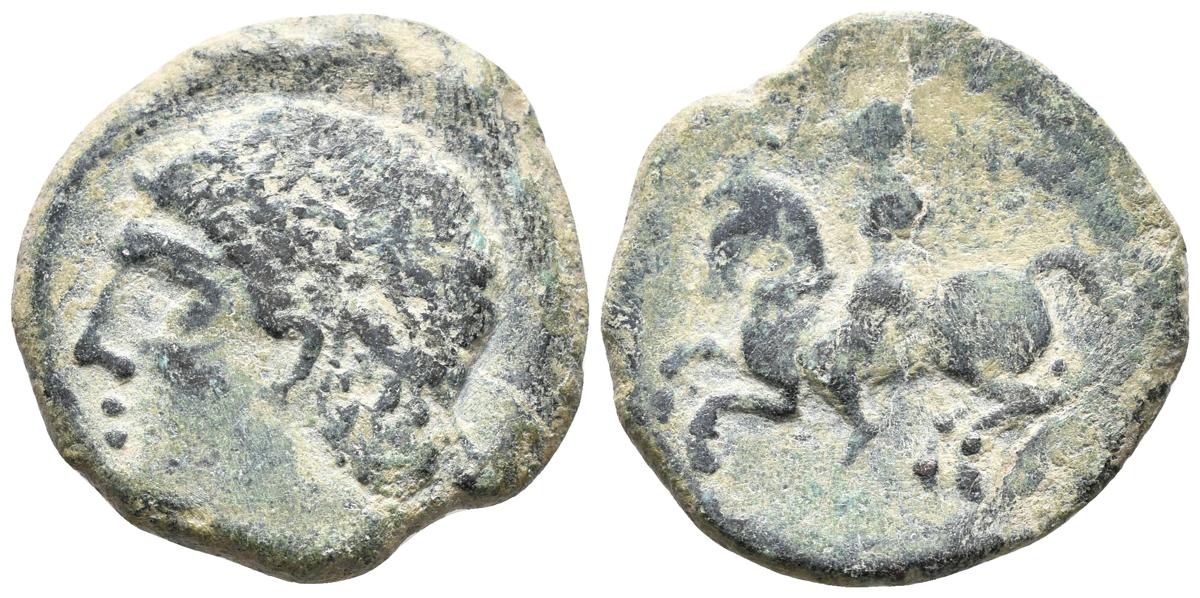 ILITURGI. As. 50 a.C. Mengíbar (Jaén). A/ Cabeza masculina diademada a izquierda. R/ Jinete con palma a izquierda, caballo con patas recogidas y sin leyenda aparente. FAB-1558var. Ae. 12,86g. MBC. Escasa.