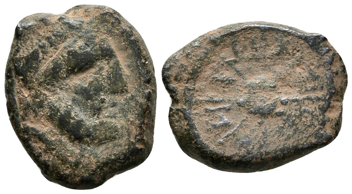 IPTUCI. Semis. 30 a.C. Prado del Rey (Cádiz). A/ Cabeza de Júpiter a derecha. R/ Rueda de ocho rayos, entre ellos leyenda libio-fenicia. FAB-1573. Ae. 5,45g. BC+.