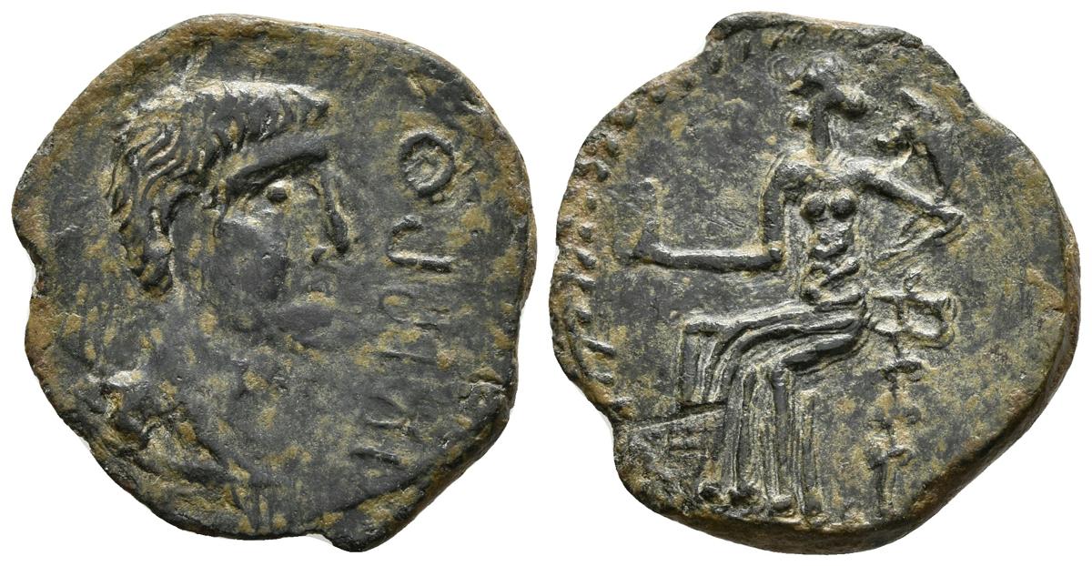 IRIPPO. As. 30 a.C. Cercanías de Sevilla. A/ Cabeza de ¿Octavio? a derecha, delante leyenda externa IRIPPO, alrededor laurea. R/ Deidad femenina sentada a derecha con piña y cornucopia rodeada de láurea. FAB-1581. Ae. 5,38g. MBC+.