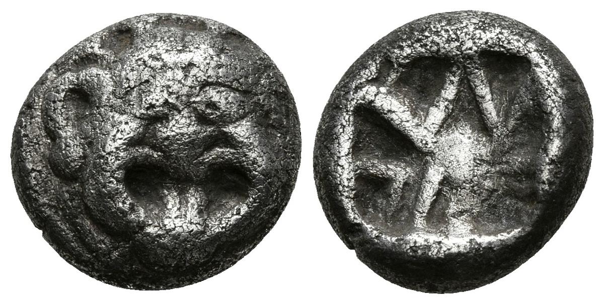 PARION, Mysia. Dracma. 500-475 a.C. A/ Gorgona de frente. R/ Diseño cruciforme incuso. SNG Copenhagen 256. Ar. 3,82g. MBC.