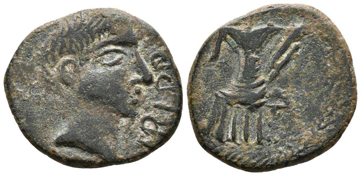 IRIPPO. As. 30 a.C. Cercanías de Sevilla. A/ Cabeza de ¿Octavio? a derecha, delante leyenda externa IRIPPO, alrededor láurea. R/ Deidad femenina sentada a derecha con piña y cornucopia rodeada de láurea. FAB-1581. Ae. 5,59g. MBC-.