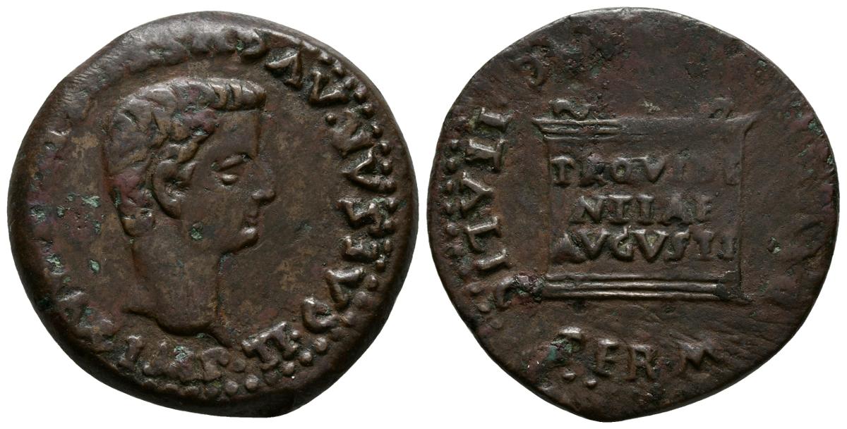 ITALICA. As. Epoca de Tiberio. 14-36 a.C. Santiponce (Sevilla) A/ Cabeza desnuda de Tiberio a derecha, alrededor IMP TI CAESAR AVGVSVS PON MAX. R/ Ara con leyenda PROVIDENTIAE AVGVSTI, alrededor PERM DIVI AVG MVNIC ITALIC. FAB-1593. Ae. 11,75g. MBC.