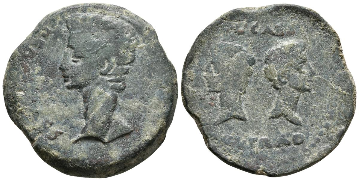IULIA TRADUCTA. Dupondio. Epoca de Augusto. 27 a.C. - 14 d.C. Algeciras (Cádiz). A/ Cabeza de Augusto a izquierda, alrededor leyenda PERM CAES AVG. R/ Cabezas opuestas de Cayo y Lucio, encima C L CAES, debajo IVL TRAD. FAB-1610. Ae. 19,13g. MBC-/MBC.