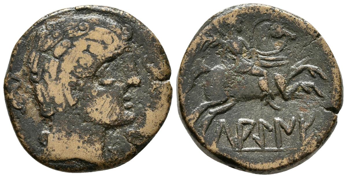 LAGINE. As. 120-20 a.C. Zona de Aragón. A/ Cabeza masculina a derecha con adornos en el cuello, rodeada de tres delfines. R/ Jinete con palma a derecha, debajo LAGiNE. FAB-1656. Ae. 9,00g. BC+/MBC.