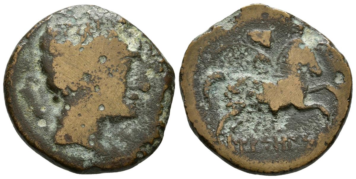 MASONSA. As. 120-80 a.C. Zona de Cataluña. A/ Cabeza masculina barbada a derecha, detrás timón. R/ Jinete con palma a derecha, debajo MASONSA con signos pequeños. ACIP-1223; CC-1322. Ae. 9,44g. BC+. Rara.